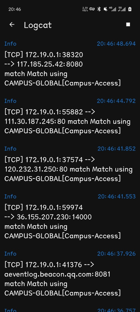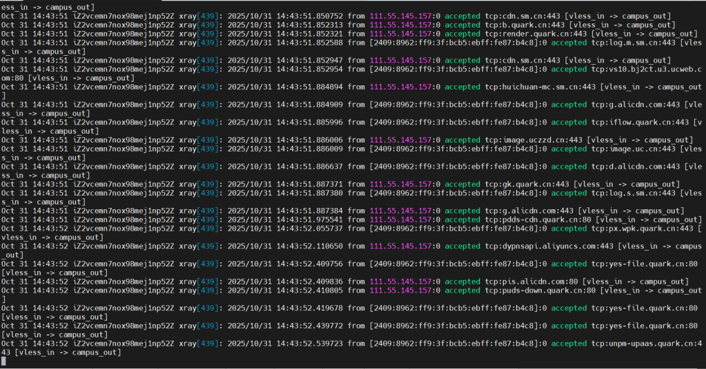 "outboundTag": "campus_out" // 强制所有流量走向 "campus_out" (frp隧道)