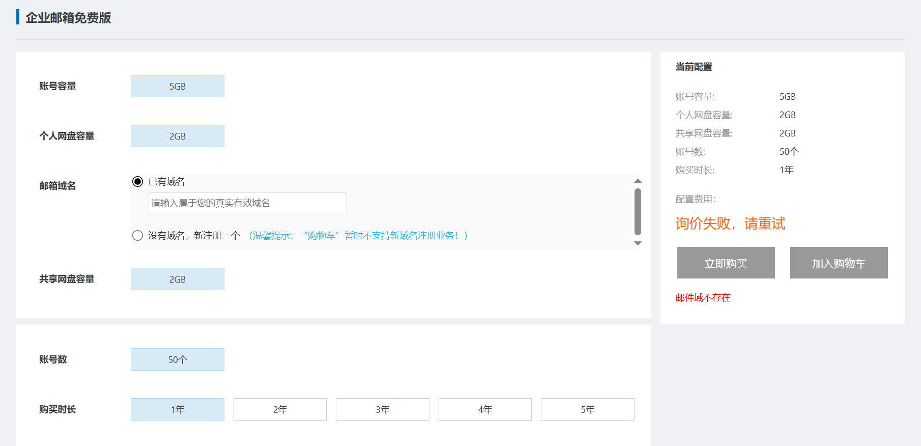 如图,企业邮箱免费版有很多限制,例如容量、账号数量等,由于1年和5年都是0元,所以直接选择5年就可以了,中途如果不想要了或者需要更换域名,都是可以直接操作的。